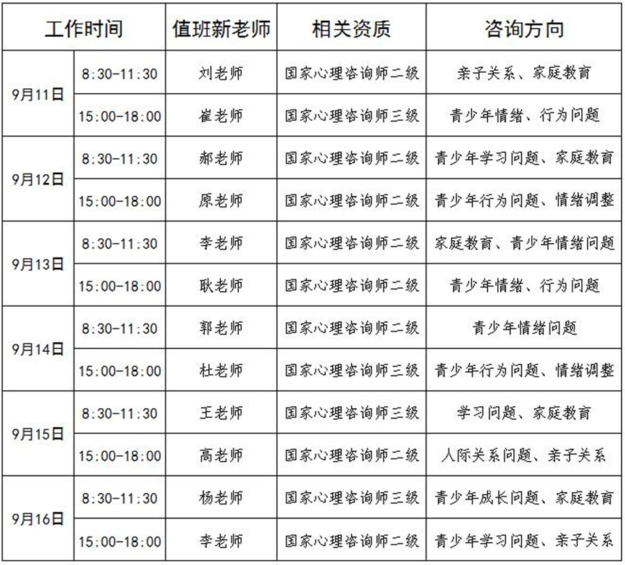 心理咨询热线、面询、在线QQ(3309557149)值班时间如下: